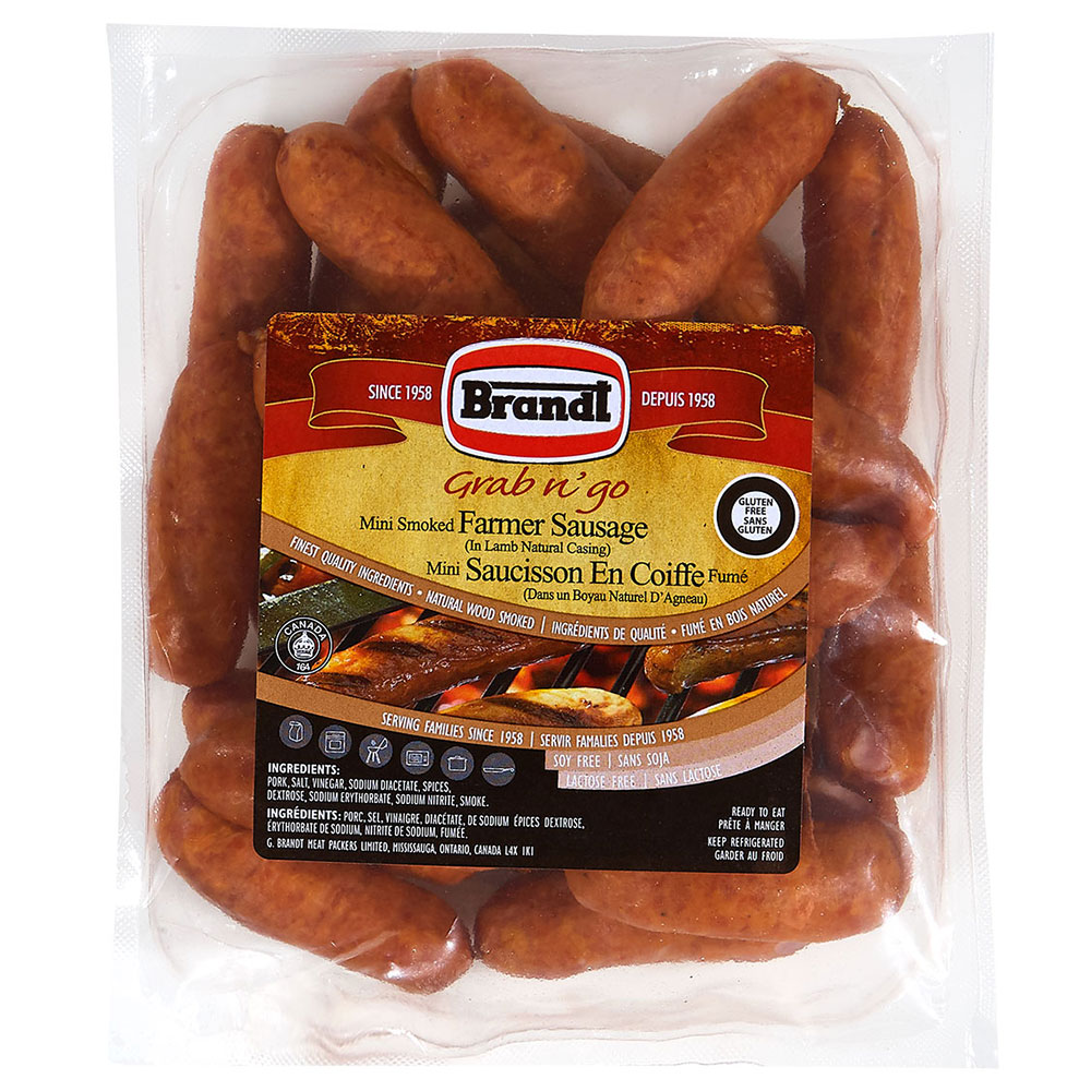 Mini Smoked Farmer Sausage 450 g Description NUTRITIONAL INFO INGREDIENTS Our Mini Smoked Farmer Sausages are Grab n’ Go Ready-To-Eat. They have a coarse texture and are well-seasoned with garlic and naturally hardwood smoked. NUTRITIONAL INFO INGREDIENTSPork, Salt, Vinegar, Sodium Diacetate, Spices, Dextrose, Sodium Erythorbate, Sodium Nitrite, Smoke.