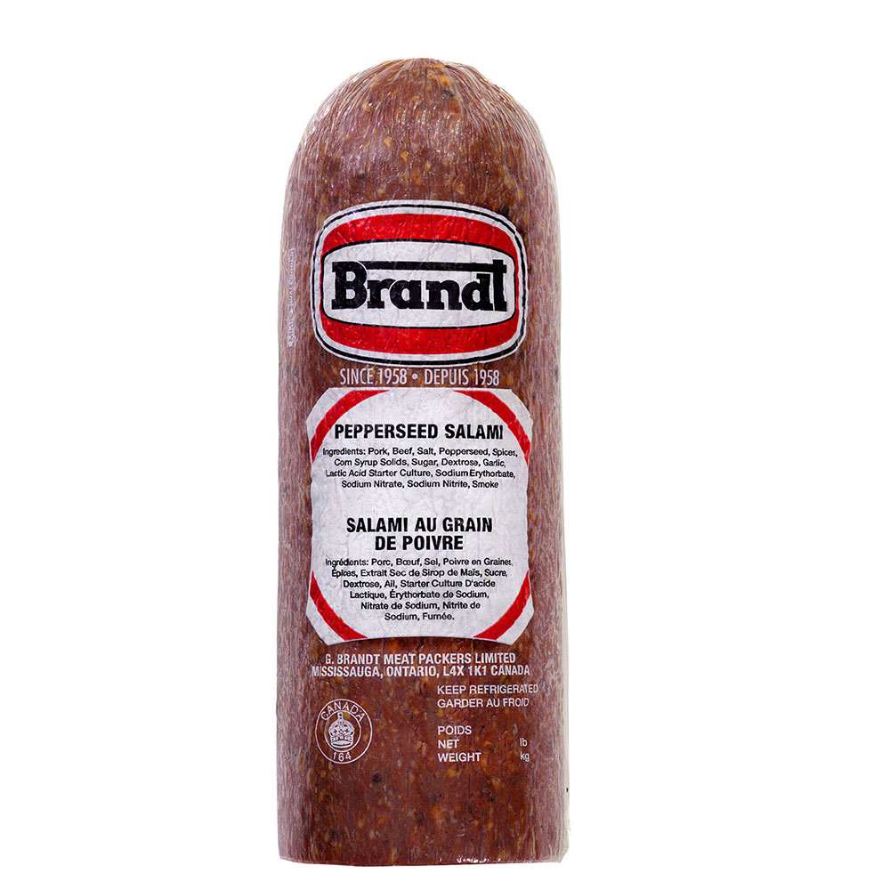 Pepperseed Salami Description NUTRITIONAL INFO INGREDIENTS Crafted in the European tradition by using both pork, beef and whole peppercorns to give it a distinctive peppery aroma and flavour. It is then dry cured and naturally hardwood smoked. NUTRITIONAL INFO INGREDIENTSPork, Beef, Salt, Pepperseed, Spices, Corn Syrup Solids, Sugar, Dextrose, Garlic, Lactic Acid Starter Culture, Sodium Erythorbate, Sodium Nitrate, Sodium Nitrite, Smoke.